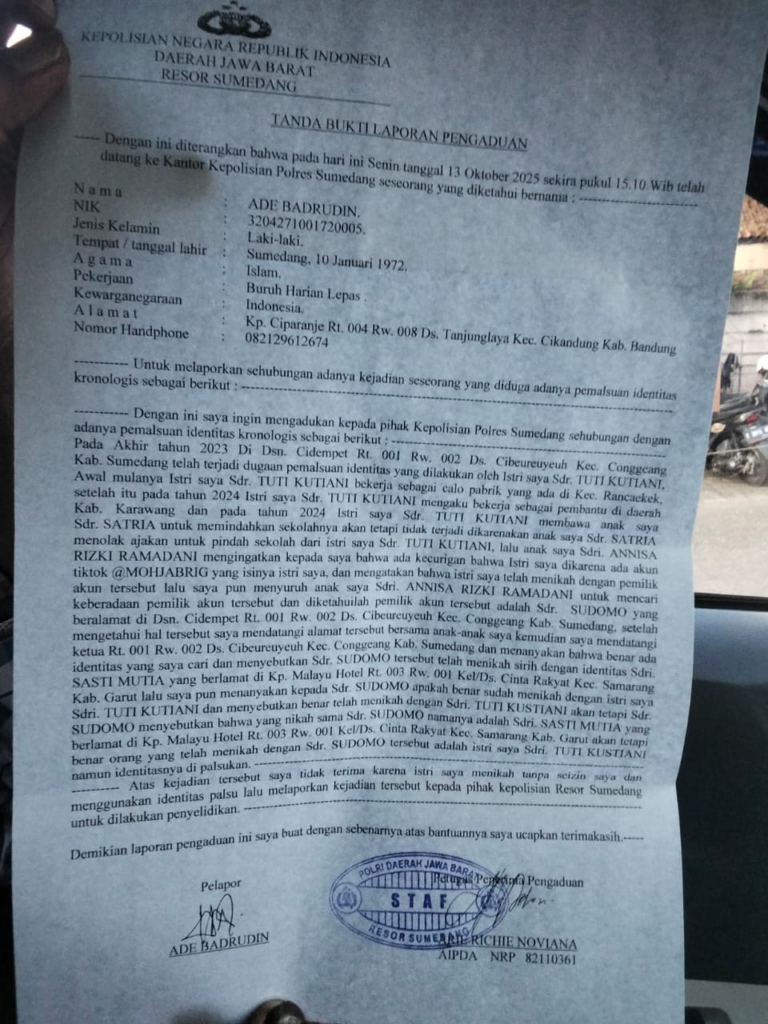 Kasus dugaan penggunaan KTP palsu kembali mencuat di Kabupaten Sumedang. Seorang ibu rumah tangga berinisial TK dilaporkan ke pihak kepolisian setelah diduga menggunakan identitas palsu untuk melangsungkan pernikahan siri dengan seorang pria bujang berinisial SD pada tahun 2023.